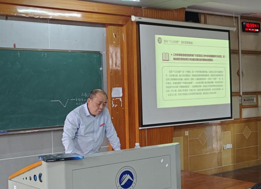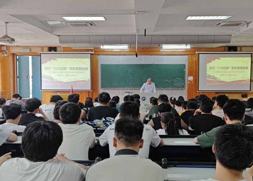 2024年6月6日,土木工程学院党委书记万文以“恪守六大纪律,筑牢思想根基”为主题,在第五教学楼2-1教室为全院学生党员讲授专题纪律党课。