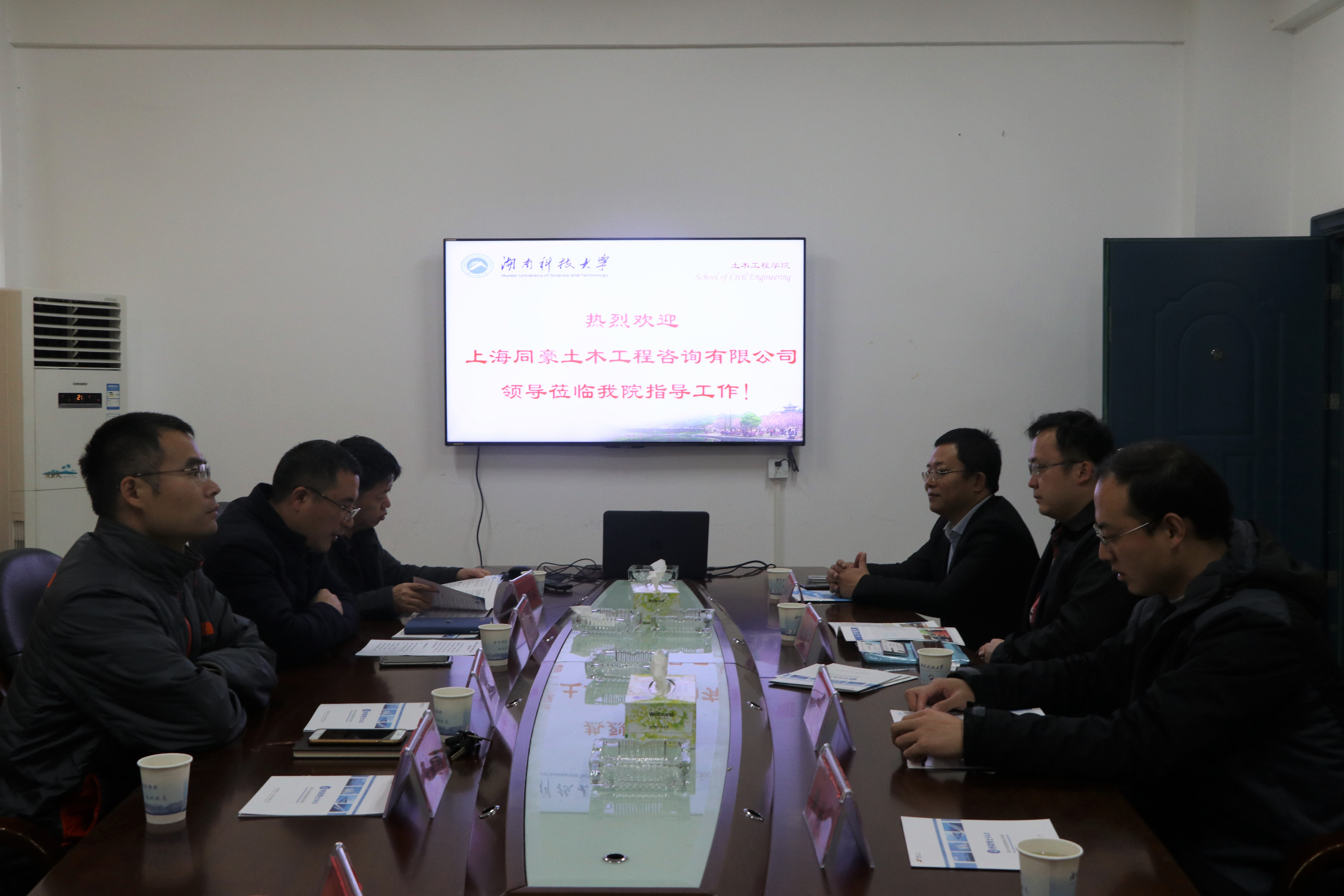 12月4日10:30,在土木楼214会议室隆重举行了上海同豪土木工程咨询有限公司与湖南科技大学土木工程学院的校企合作授牌仪式。上海同豪土木工程咨询有限公司董事韩吉峰、高校中南区总经理李宏涛、专业技术支持张楠,土木工程学院院长祝明桥、副院长郝小礼、副院长孙洪鑫、副院长汪建群、建筑工程系系主任黄海林、工程管理系系主任肖全东出席,并就合作内容进行深入交流。副院长郝小礼主持本次会议。