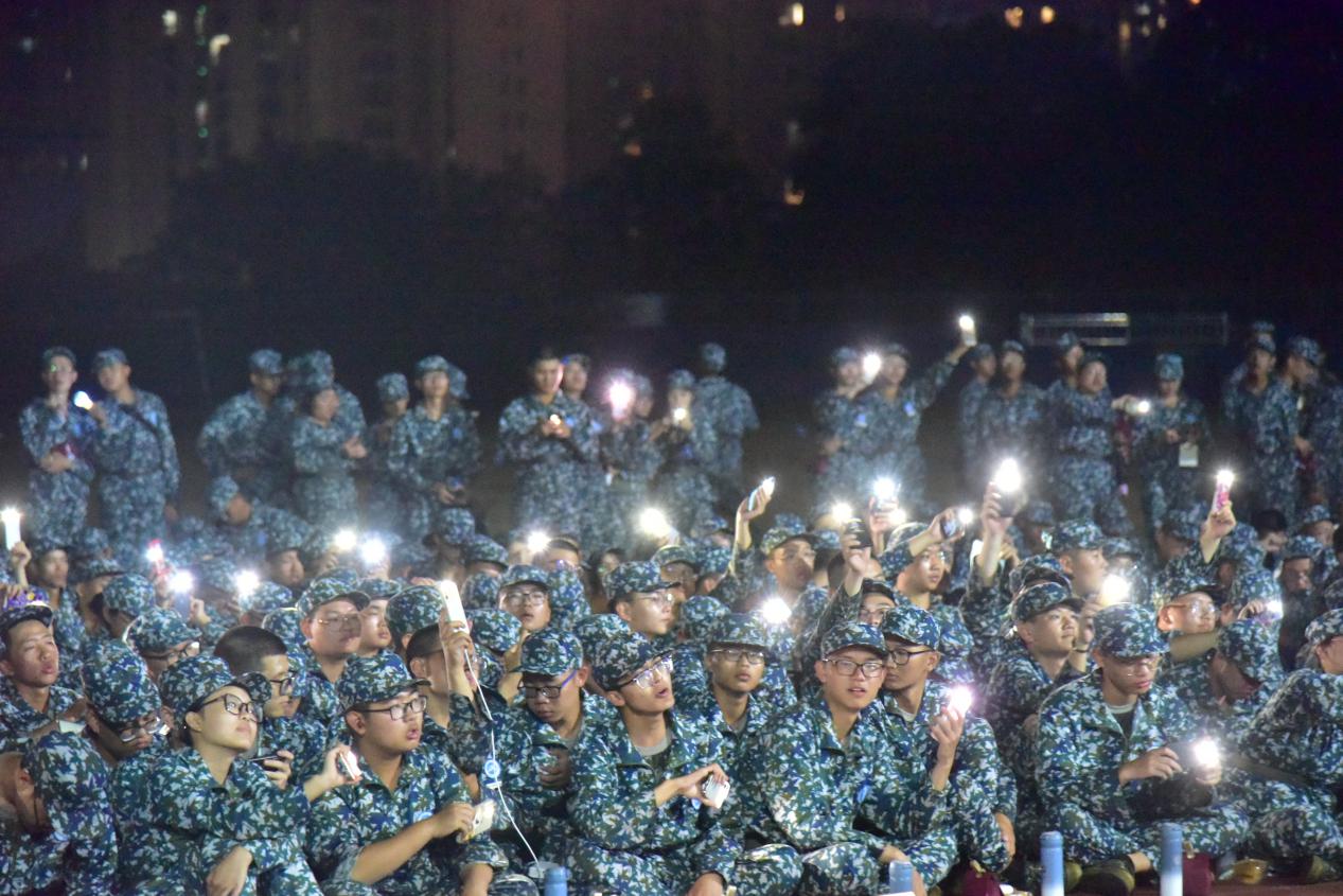 我校为了慰新生们的拳拳思家之情还特意组织了一场精彩纷呈的军训汇演。现场氛围高涨,当学长学姐们表演时,新生们也在台下伴随着歌声轻轻哼唱;或在精彩之处奋力鼓掌呐喊助威。